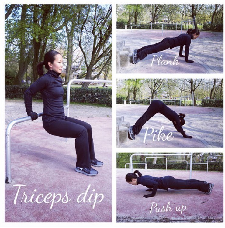 - 5. Wall Sit (zie houding Triceps Dip, maar dan met je rug tegen de muur en enkels onder je knieën)